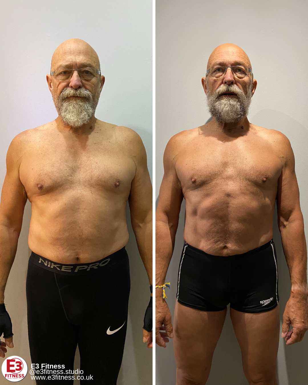“I'm in my seventies, so when I started training at E3 my targets were modest. I wanted to lose some weight and gain some tone. I was surprised and delighted by how much my body changed, in a good way, after a few sessions of weights and core exercises under David's expert tuition. His feedback and supervision of my eating and drinking regime has proved a bonus. I could not recommend E3 more strongly..for all ages.”